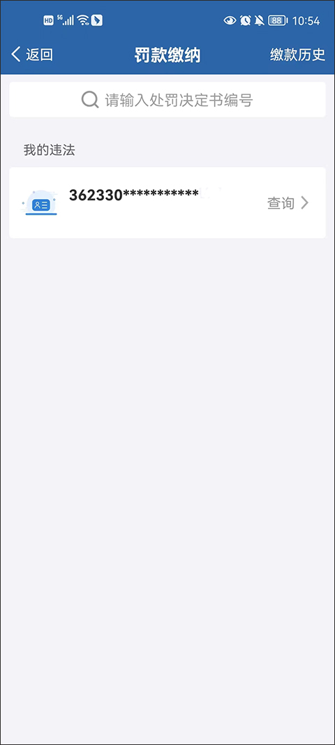 3、用户可以直接输入处罚决定书编号,也可以通过身份证一键查询。