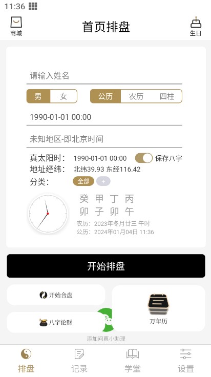 3、进入软件后默认为排盘页面,在此页面可以输入自己的个人信息开始排盘。
