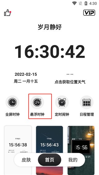 2、首页如图,有全屏时钟、悬浮时钟、定时闹钟、日程管理,下面就是一些皮肤主题了。