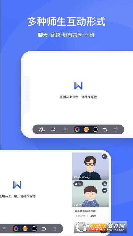 2. 直播互动教学,涂鸦、奖励、答题等多种师生互动形式;