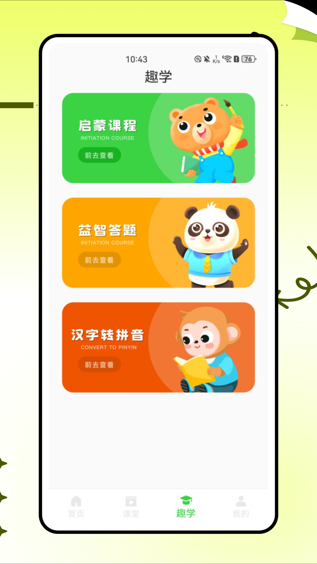 掌握了一些知识以后,就可以开始答题体验了,各种有趣的启蒙可成和益智内容让孩子轻松掌握。