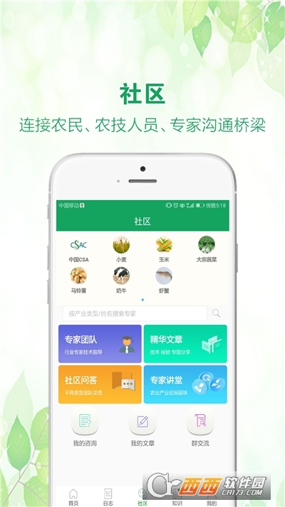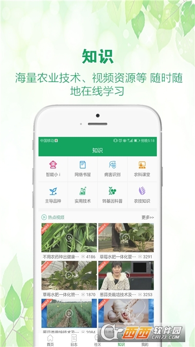 其中包括农业资讯、农技问答、技术交流、在线学习、成果速递、视频课堂等主要功能。
