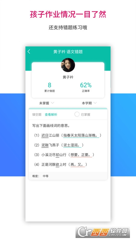 进行教材同步练习;参与活动;展示才艺;了解孩子学习情况;了解学校、班级动态;亲子互动学习等功能。