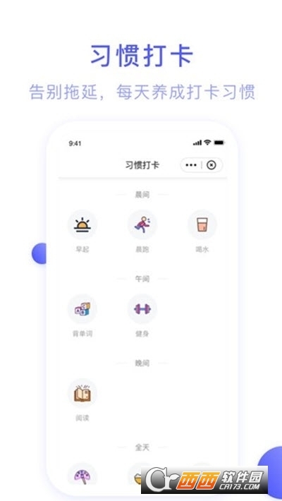 习惯打卡:记录你要养成的习惯,生成详细的打卡记录,追踪你每日的时间记录例如:目标打卡,喝水打卡,早起起床打卡,早睡打卡,签到打卡,学习打卡,上课打卡,网红打卡,21天日常习惯打卡计划等。