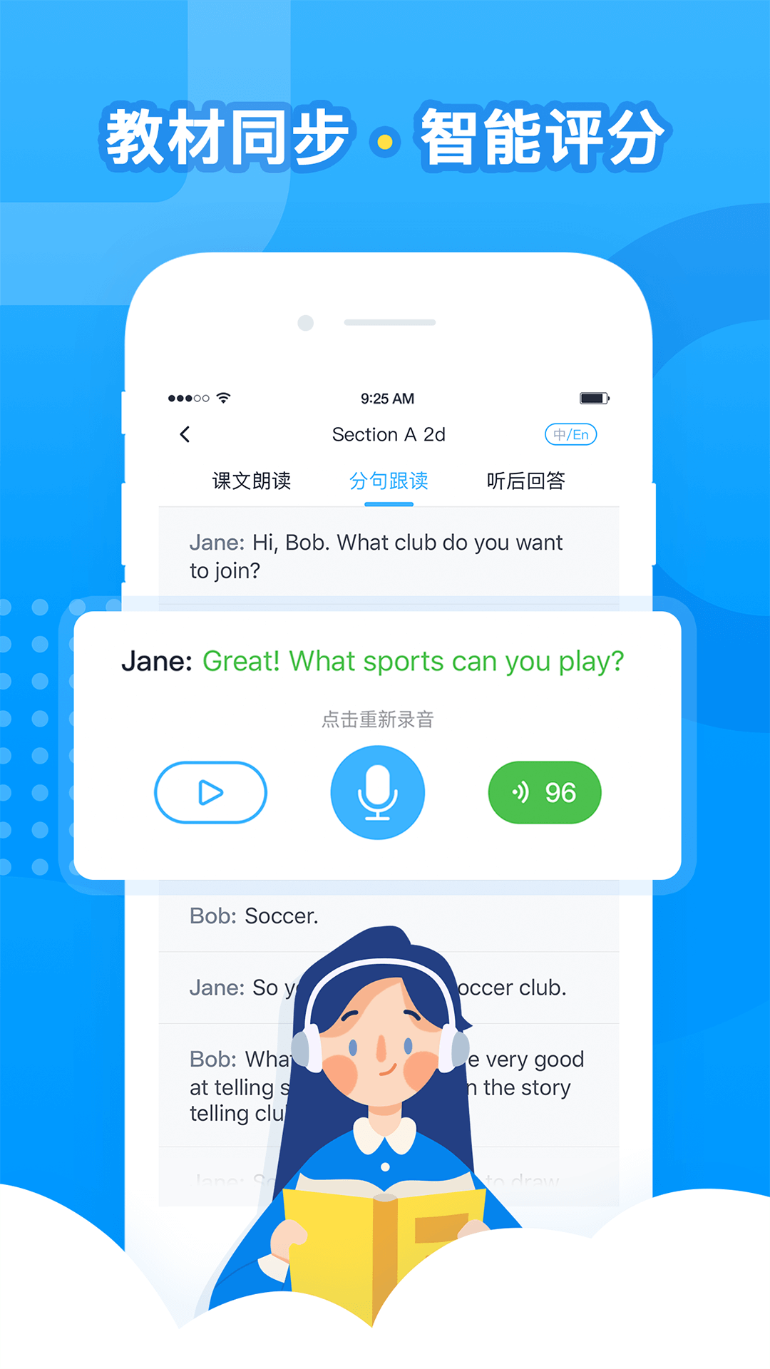 2、根据用户的学习情况进行智能评分,给出专业的英语学习建议。