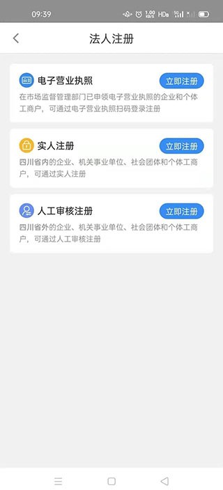 5、选择法人登录,在电子营业执照栏中,点击立即注册;