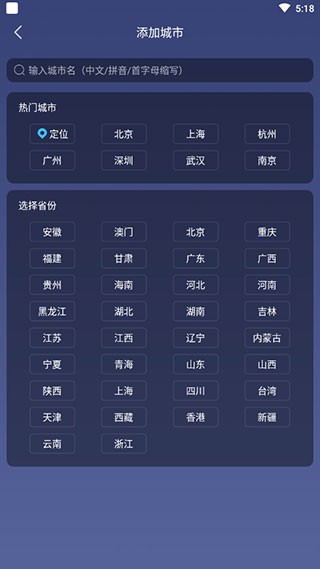 3、手动定位,直接在搜索栏中搜索想要知道的城市点击即可添加。