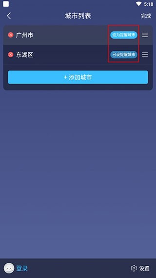 4、在城市列表页选择编辑可以设置需要主动提醒的城市。