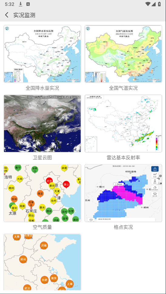 3、点击实况检监测,可以查看全国实时降水,气温,云图等信息