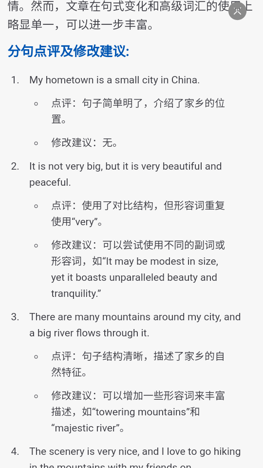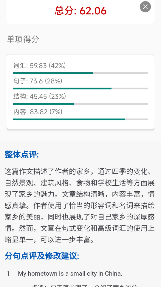 4、再接着往下滑动,还可以浏览分句点评以及修改建议。