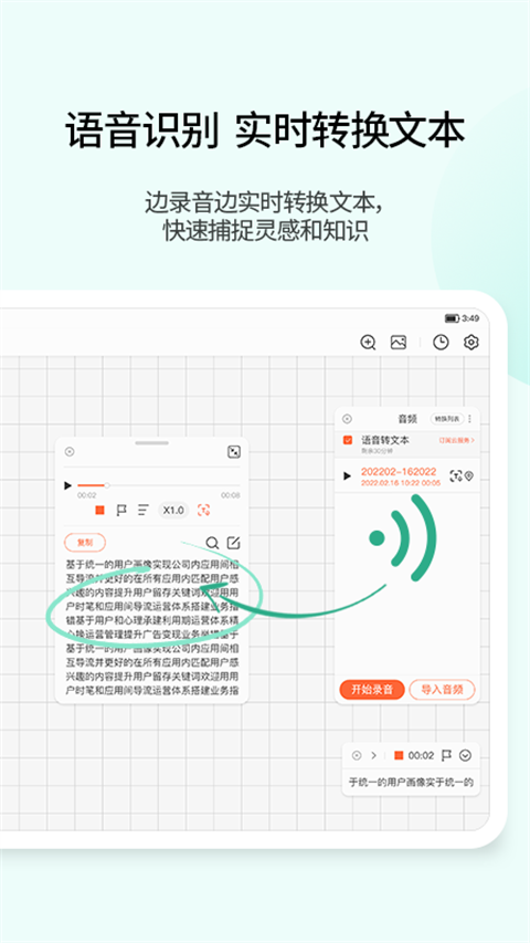 支持智能搜索手写内容、文字内容、录音内容、图片内容,智能翻译多种语言,智能分析重点词汇、内容OCR扫描识别、图片转文字、实时手写转文字、录音转文字、实时语音转文字方式转化为可编辑笔记。