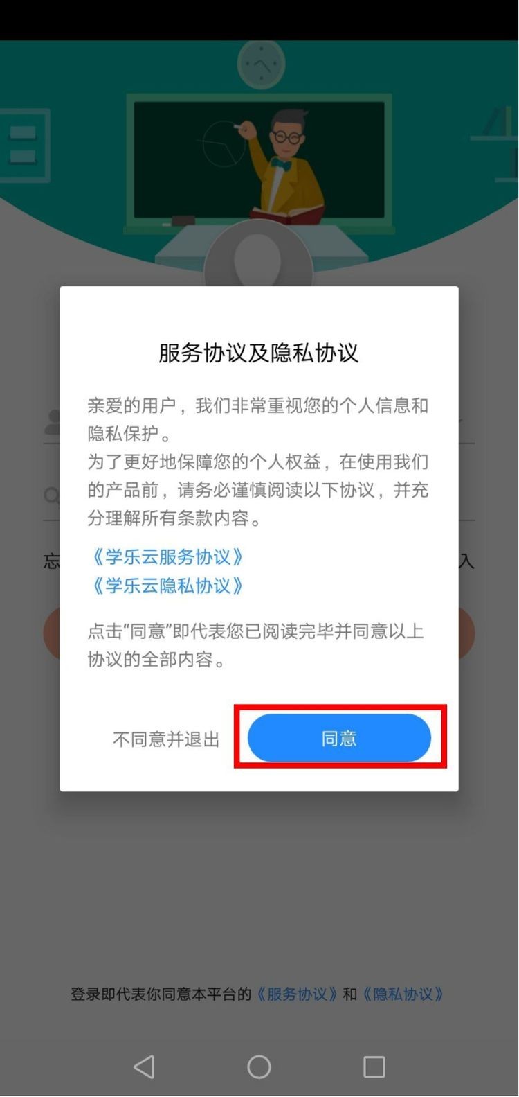 点击手机桌面的“学乐云教学”进入APP,此时会有一个隐私协议,选“同意”。