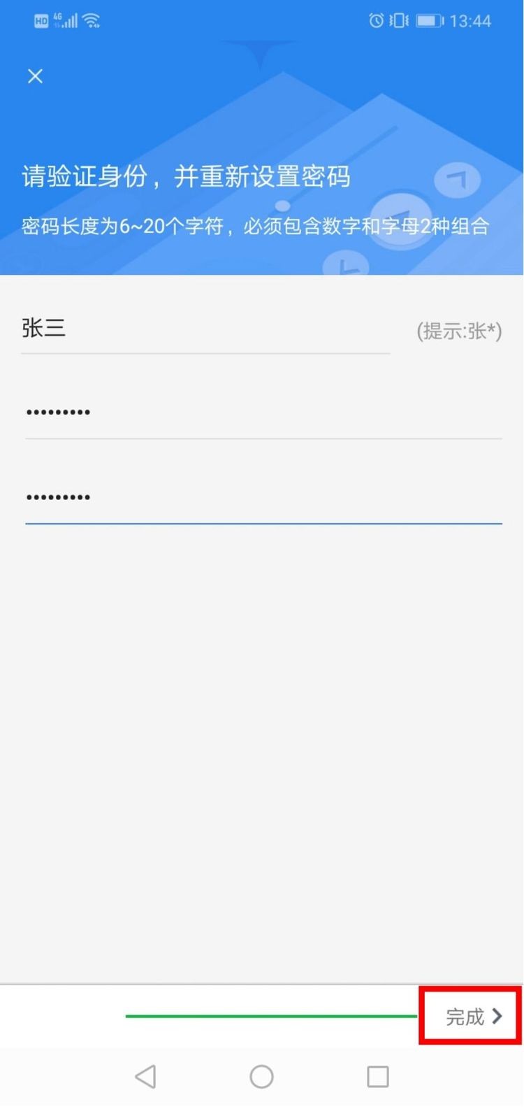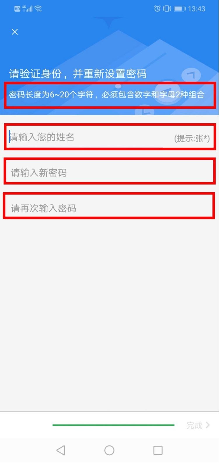 输入您孩子的姓名(注意姓名之间不能有空格),设置新密码。密码长度为6-20个字符,需要是字母和数字2种组合,请牢记您设置的新密码,以后登录都使用这个新设置的密码。