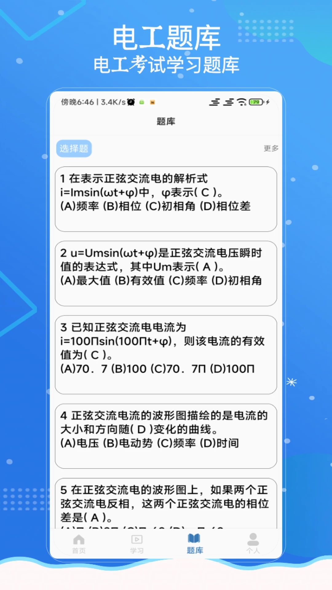 电工是一款专业技术人员培训上岗题库软件,为用户提供更加精准高效的做题服务,通过手机就可以进行学习,还有防爆电器作业以及初级电工证等在这里可以进行题库训练,还有更多题型以及图文信息在这里可以获取,感兴趣的快来下载软件试试吧。