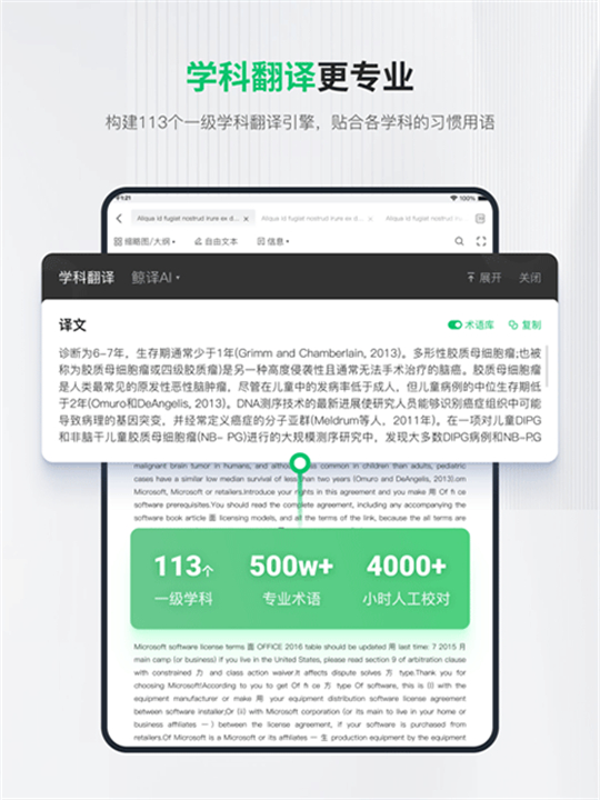 1、113个以及学科的翻译引擎,精准贴合每个学科的用语翻译。