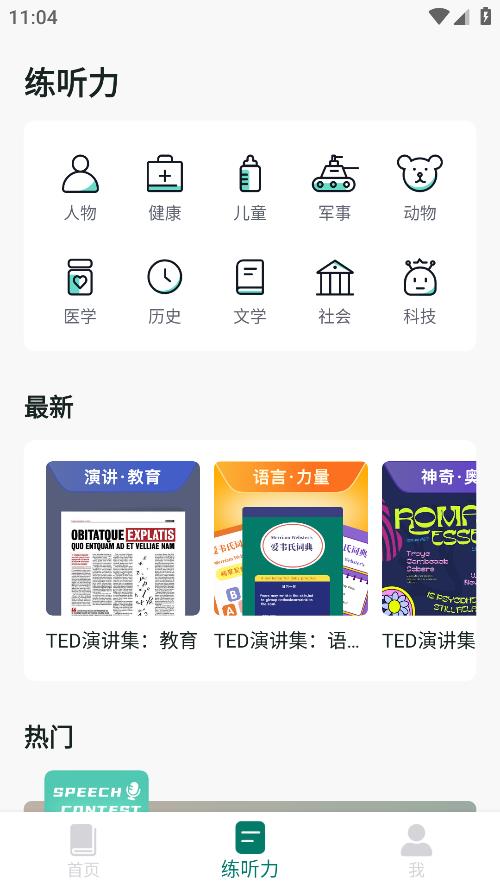 3、选择练听力的功能,最下方中间位置就是练听力了,而且进行了分类,人物、健康、儿童、军事、动物、医学、历史、文学、社会、科技全部都有。