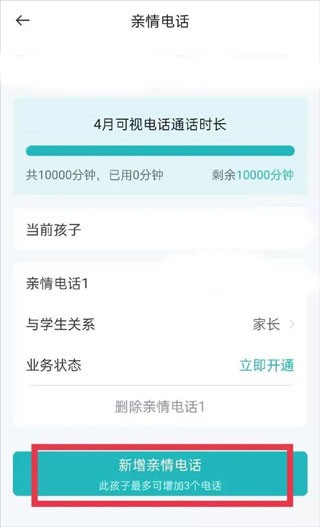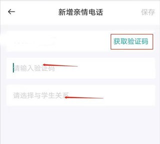 3、按照页面提示,在第一栏输入手机号,点击“获取验证码”,把收到的4位数验证码填写到第二栏。选择好与学生的关系后,点击页面右上方的“保存”即可。添加好以后,学生即可向此号码拨打电话,未添加的号码不能拨打。