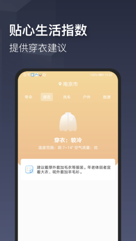 6、生活指数:多方位贴心生活指数,涵盖带伞、穿衣、洗车、户外、旅行、防晒、钓鱼等多个建议提醒,为用户出行保驾护航。