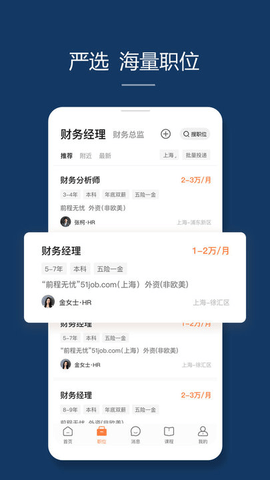 前程无忧51Job一款很可靠的求职招聘服务软件,一键定位就能在你所在的城市中找到更多你想要的工作,还能线上沟通来自各行各业的丰富职位让你拥有更多的选择快来试试看吧!