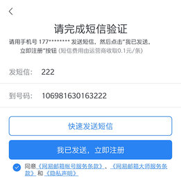 需要用手机号发送短信,推荐点击快速发送消息,然后点击我已经发送,立即注册就可以了,需要勾选下面的同意按钮,小提示0.1元的短信费。
