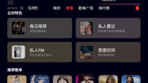 网易云TV版主要分为四个分区,发现专栏中主要是云村特色功能,如【私人雷达】、【私人FM】等,除此以外,TV版还增加了一项新的功能——【氛围空间】。旨在创建沉浸式音乐氛围,从耳边到眼前的身临其境感。