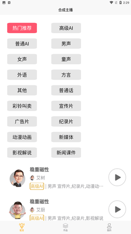 2、在幕后大师app中,有很多的主播语音的类型推荐,各种的声音风格多种多样,让用户可以选择自己感兴趣的内容进行选使用,方便快捷;