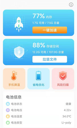 这是一款非常实用的手机垃圾清理工具,提供了垃圾清理、超级省电、手机降温、手机加速等多种服务功能,帮助用户一键清理手机中的垃圾,释放内存,手机不会再出现卡顿发热情况,软件功能十分强大!