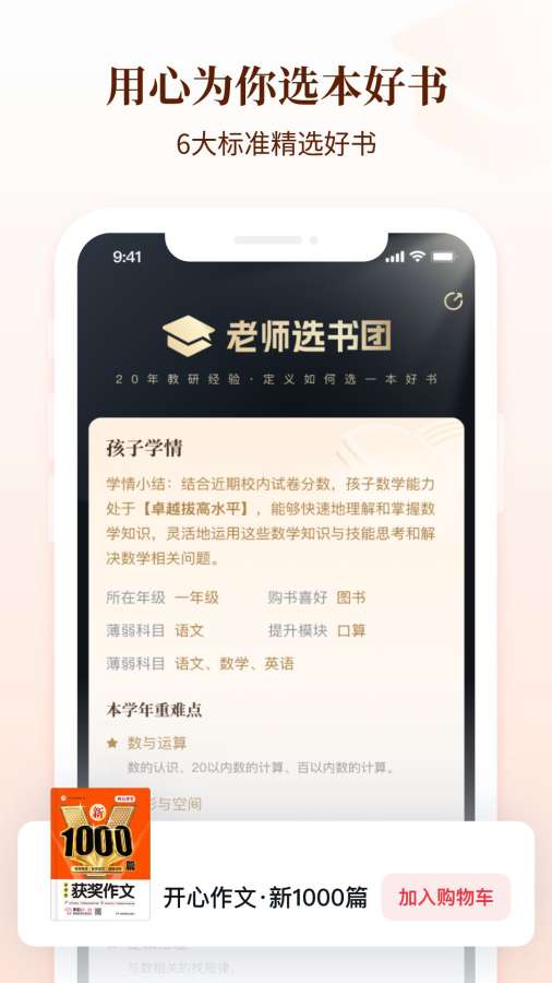 好未来老师选书团,基于20年教研经验沉淀,6大标准严格评价每一本图书,从上万册图书中精心挑选适合不同年级不同阶段学生的学习用书及课外读物,让选书变得不困难。