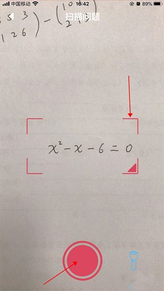 3、打开手机摄像头,将题目置于屏幕提示的区域内,然后点击下方的红色按钮;