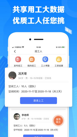 1、是一款非常实用的招工服务软件,软件功能非常强大,里面提供海量的工作资源和工人信息;