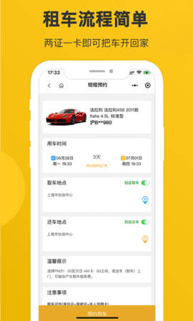 3、省去繁琐流程,只需要提供驾驶证和身份证,绑定银行卡就可以立马提车,按天计费。