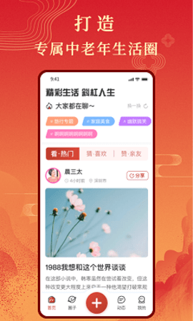 中老年人的社交服务平台,汇聚大量志趣相投的好友,加入感兴趣圈子,分享个人生活、看法,认识更多新朋友,享受贴心生活服务。专为中老年用户打造的生活社交服务圈;寻找兴趣相投的伙伴,追忆有情有义的温情时代!