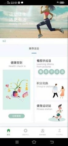 2.软件还为用户推荐了很多的活动,比如健康签到、看图学成语、积分兑换、以及健身运动站等等,用户可以个性化的进行选择,在线参与自己喜欢的活动。