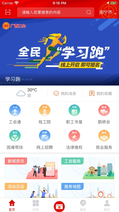 “广西网上工会”APP以移动互联网为主要通道,功能模块包含工会通、桂工院、职工书屋、鹊桥会、困难帮扶、网上招聘、法律维权、就业服务、新闻资讯、工会服务、活动互动、服务地图等主体功能。会员可使用App查询工会信息、浏览工会资讯、参与工会活动、享受线上服务。