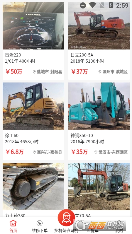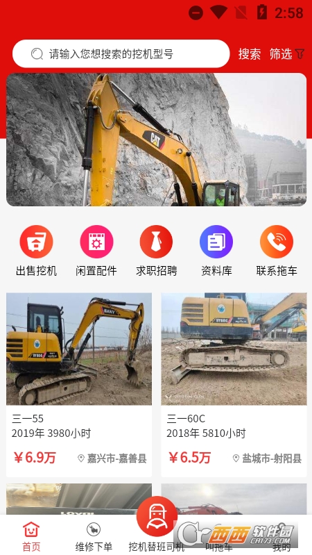 应用一共包括7个板块:挖机出售、维修、资料库、挖机替班、招聘、拖车服务、挖机配件。