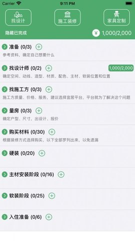 2、严选装修攻略和装修流程,让你轻松学会走线布局、水电改造、建材挑选、家具选购、空气治理,让你的装修少走弯路。