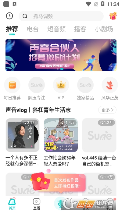 1、一个年轻人专属的生活解压音频平台,集聚播客、电台、广播短剧、有声书等声音内容,让所有Z时代小伙伴通过Sure感受声音营地的奇妙能力。