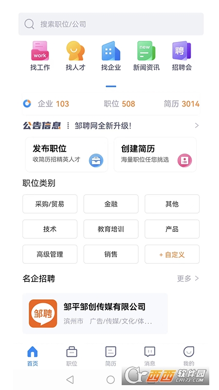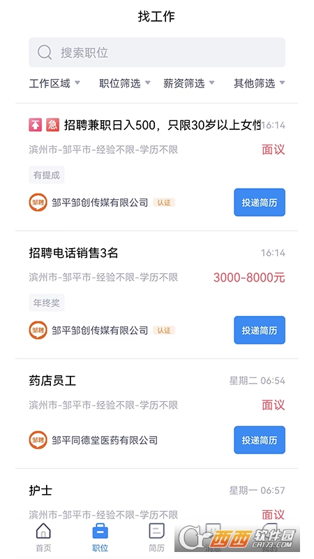 邹聘网(邹平求职招聘)是一款专为邹平人设计的找工作招人才服务平台,使用方法简单,轻松完成求职招聘服务,可以自由搜索职位或者公司,在这里选择不同身份,上传编辑简历,还可以发布招聘信息,让用户更好就业用工,需要伙伴,鳄斗163手游网使用吧!