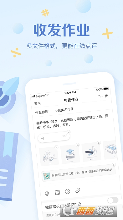 实时快捷布置作业,支持发送图片、语音、文字、视频、链接等内容。 例如把黑板作业拍摄下来发送给学生及家长,再也不用担心孩子记错作业内容。