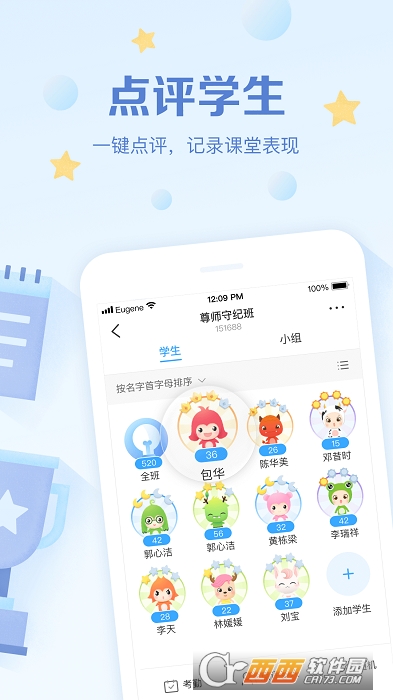 创建自己的班级,邀请学生及家长加入,海量有趣的卡通头像代表着每位学生,不管是在课堂还是在课余时间,都可以根据评语模板随时对学生进行多元化评价记录,老师不必花时间去统计总分,
