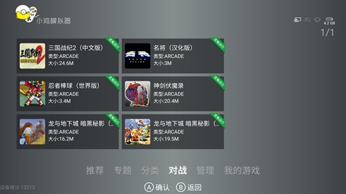 打开小鸡模拟器,进入主界面,在画面下方共分有6个项目,分别是【推荐】、【专题】、【分类】、【对战】、【管理】、【我的游戏】,可以通过电视的遥控器与小鸡手柄实现页面之间的切换。