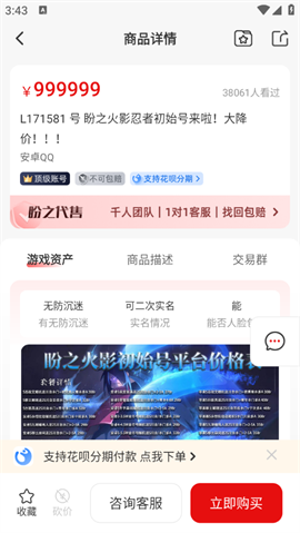 3、挑选想要的游戏账号,点进详情页面,查看账号信息,可以对商品进行砍价,也可以立即直接购买。