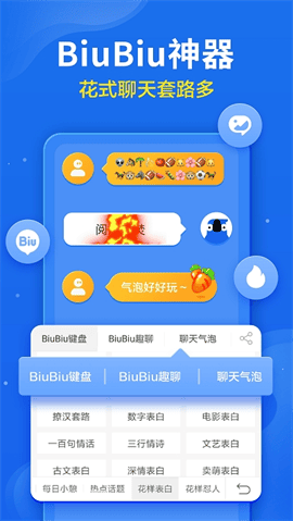 biubiu键盘不用打字,聊天神器一秒上屏99+。丰富语料,花样表白、追星专用、戏精、正能量、神吐槽等,biubiu一下,制霸聊天窗口
