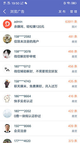 1、登陆APP以后,我们找到“我的”-“悬赏管理”入口,点击进入,选择发布,如下图所示: