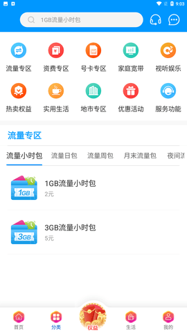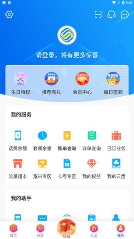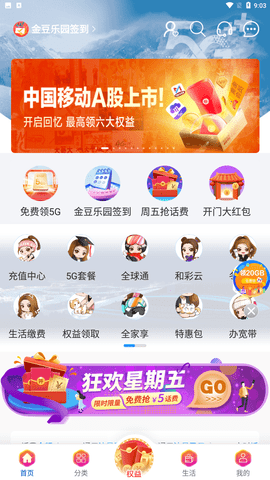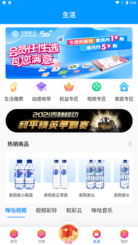 【权益中心】生活权益、全球通权益、省内商家优惠。