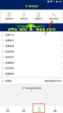 1.在服务栏目中点击报修与投诉按钮