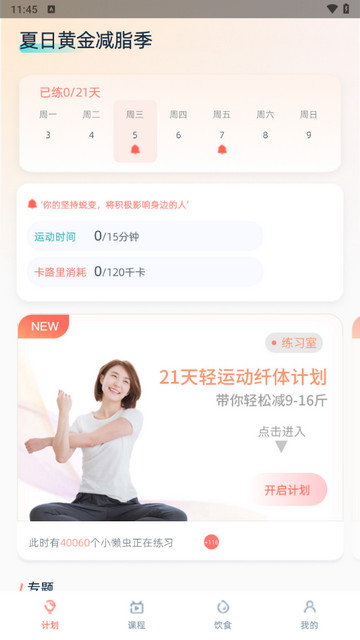 懒人轻运动是一款非常好用的运动健身管理软件,它不仅为用户提供了专业的运动健身课程,还为用户提供了健身打卡功能,让用户能够每天进行运动打卡,帮助用户养成每天健身的好习惯,还有着专业的运动数据统计,让用户能清晰的看到自己的运动变化,提高用户运动动力。感兴趣的小伙伴快来本站下载体验吧。
