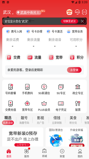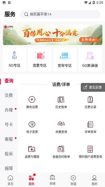2、实时话费、套餐余量、缴费充值、宽带报装、5G办理,足不出户即可完成。