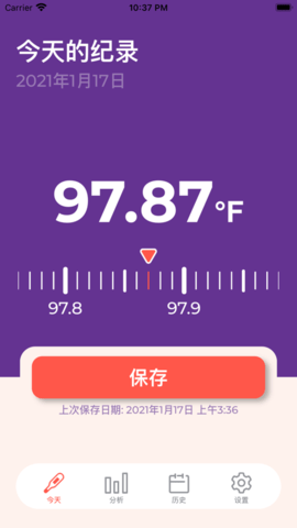 3.只需在主屏幕上左右移动秤以设置体温,然后点击保存按钮即可轻松记录体温并节省时间。