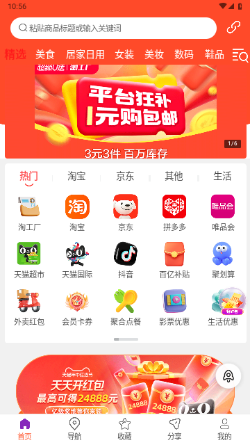 3、省钱:各种特价专区,网罗全网最优惠、最热销商品,领券超低价,人气爆品低至1元!